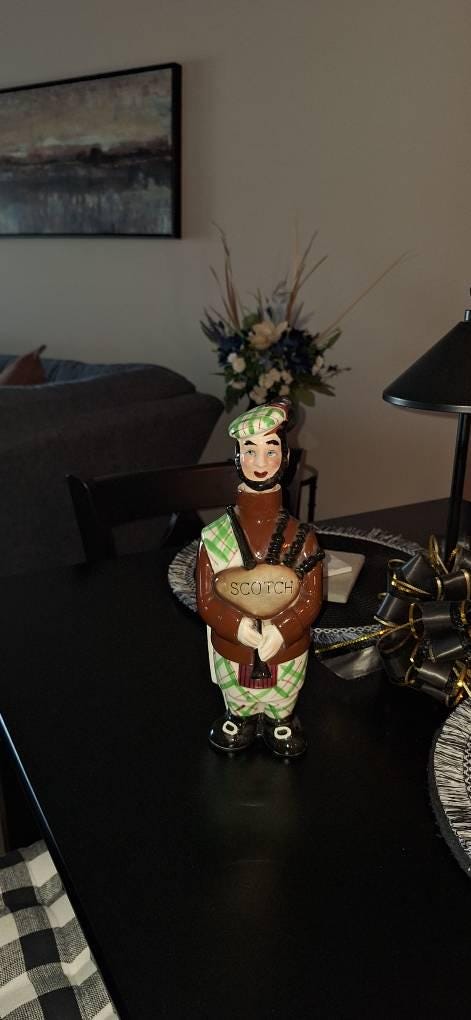 Vintage Ceramic Scotch Decanter featuring a hand-painted figural Scotsman design, made in Japan during the 1950s. This decanter includes a lid/stopper and is a unique piece of barware suitable for all occasions.