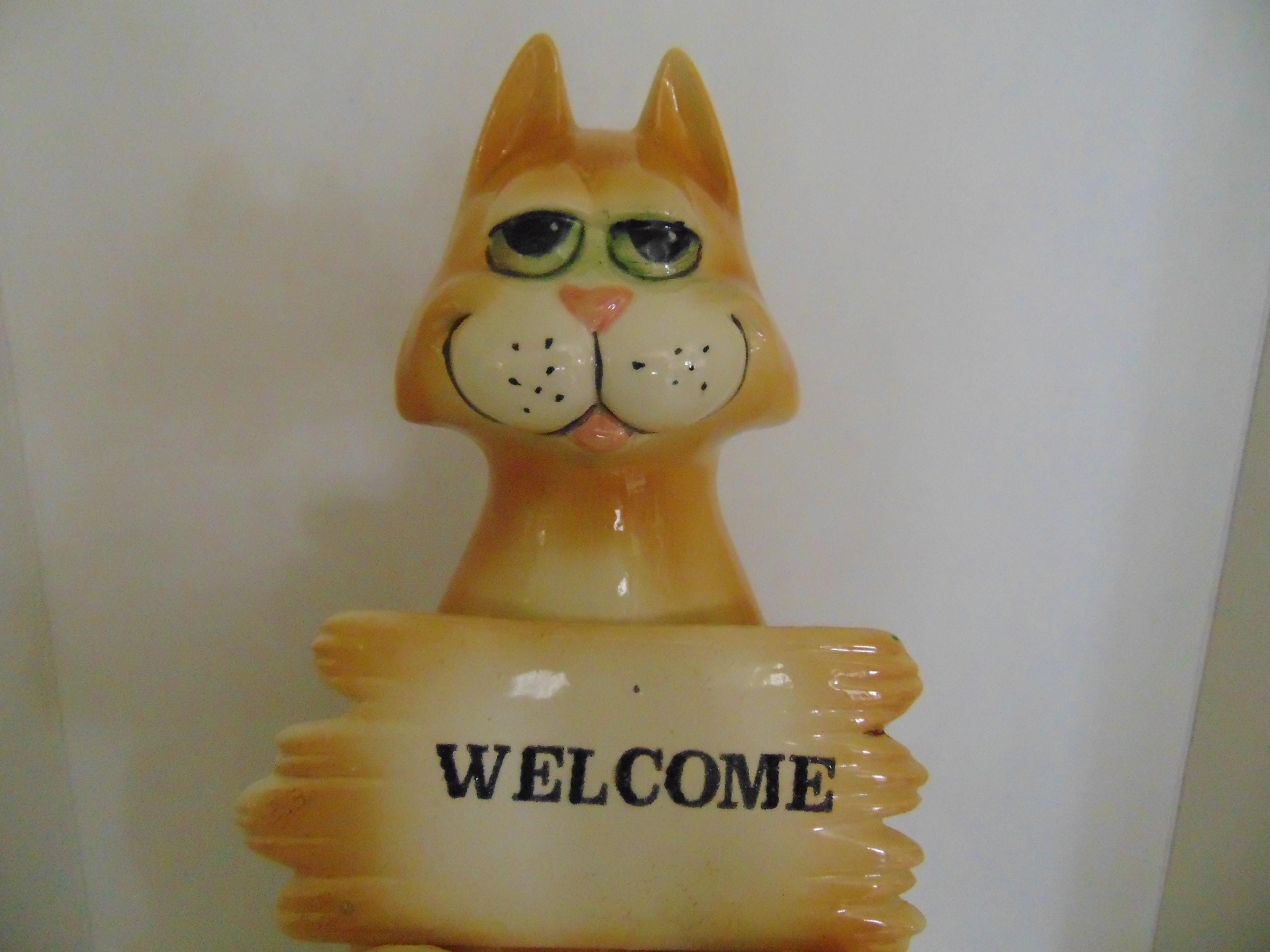 Attention all Cat Lovers! This is must-have to welcome all your guests to your pet friendly home. This statue stands 18" tall. The label is both sides one say welcome the other cat lives matte.