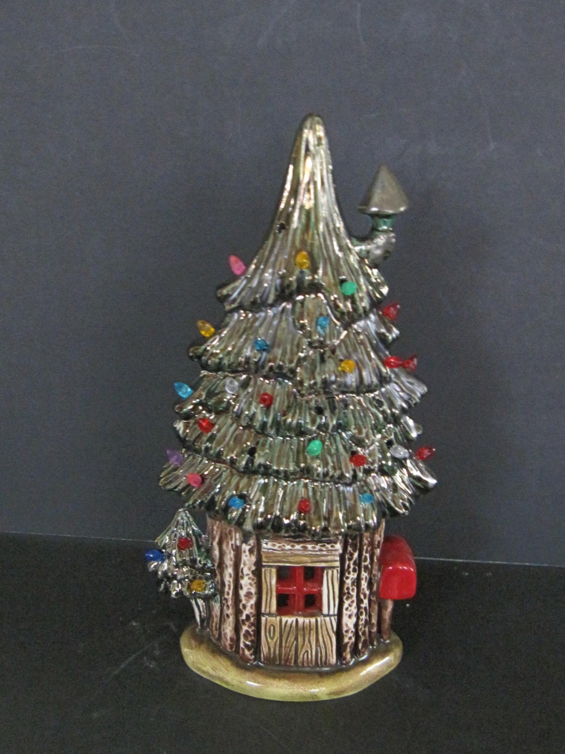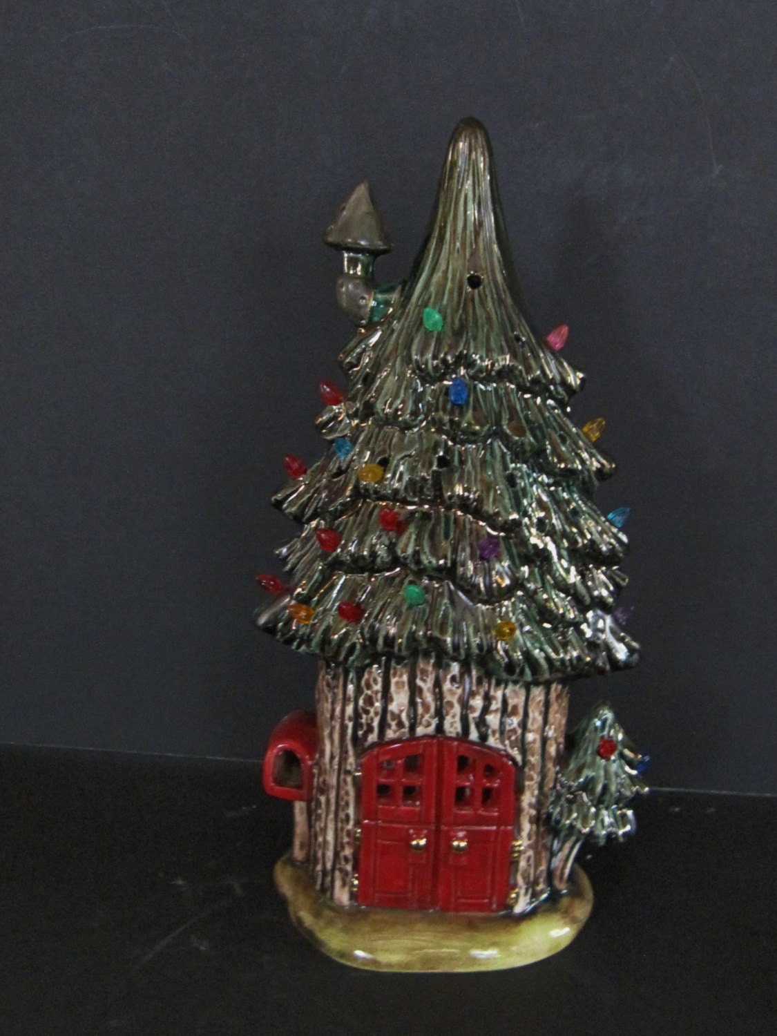 The adorable fairy christmas tree house is a Christmas tree with lights, I put holes into it to hold little plastic bulbs in the Christmas tree house