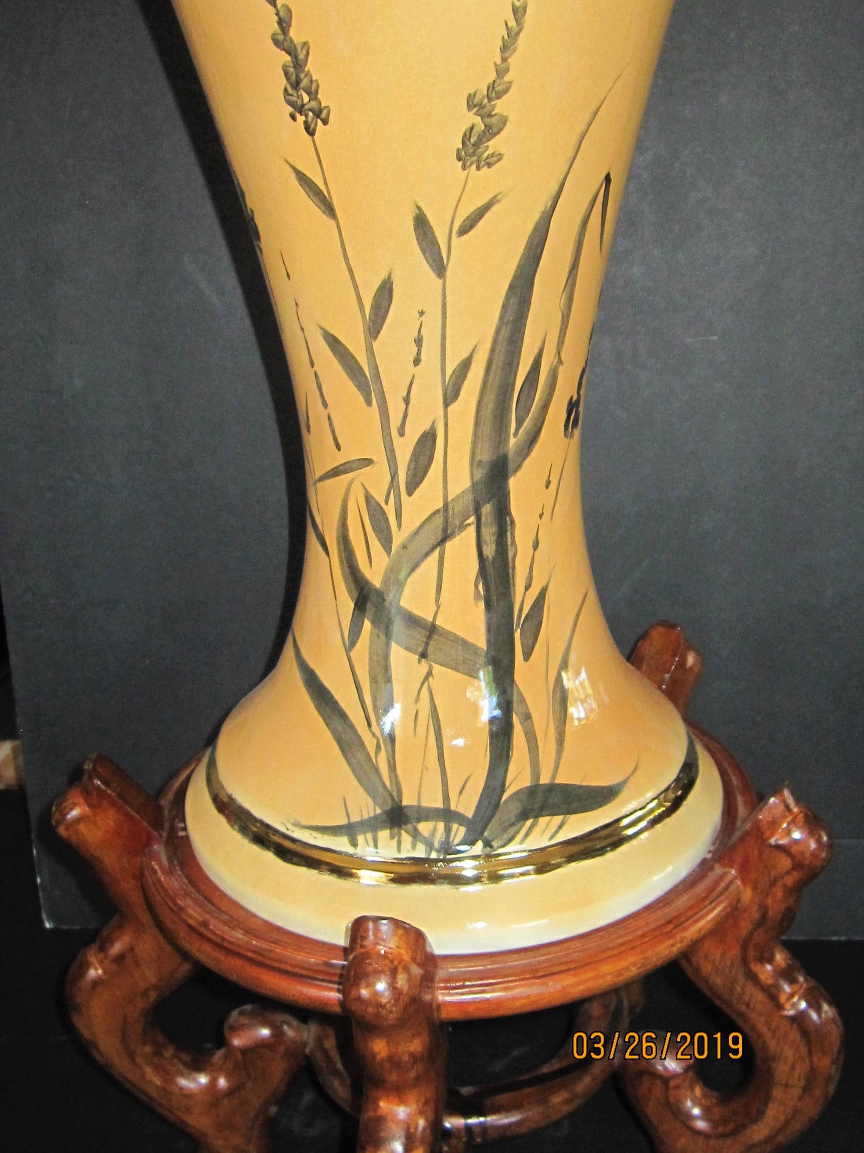 Beautiful Tall Oriental Vase in Ceramic with Hand Painted Floral design and Gold Accent. It have a wood Stand.