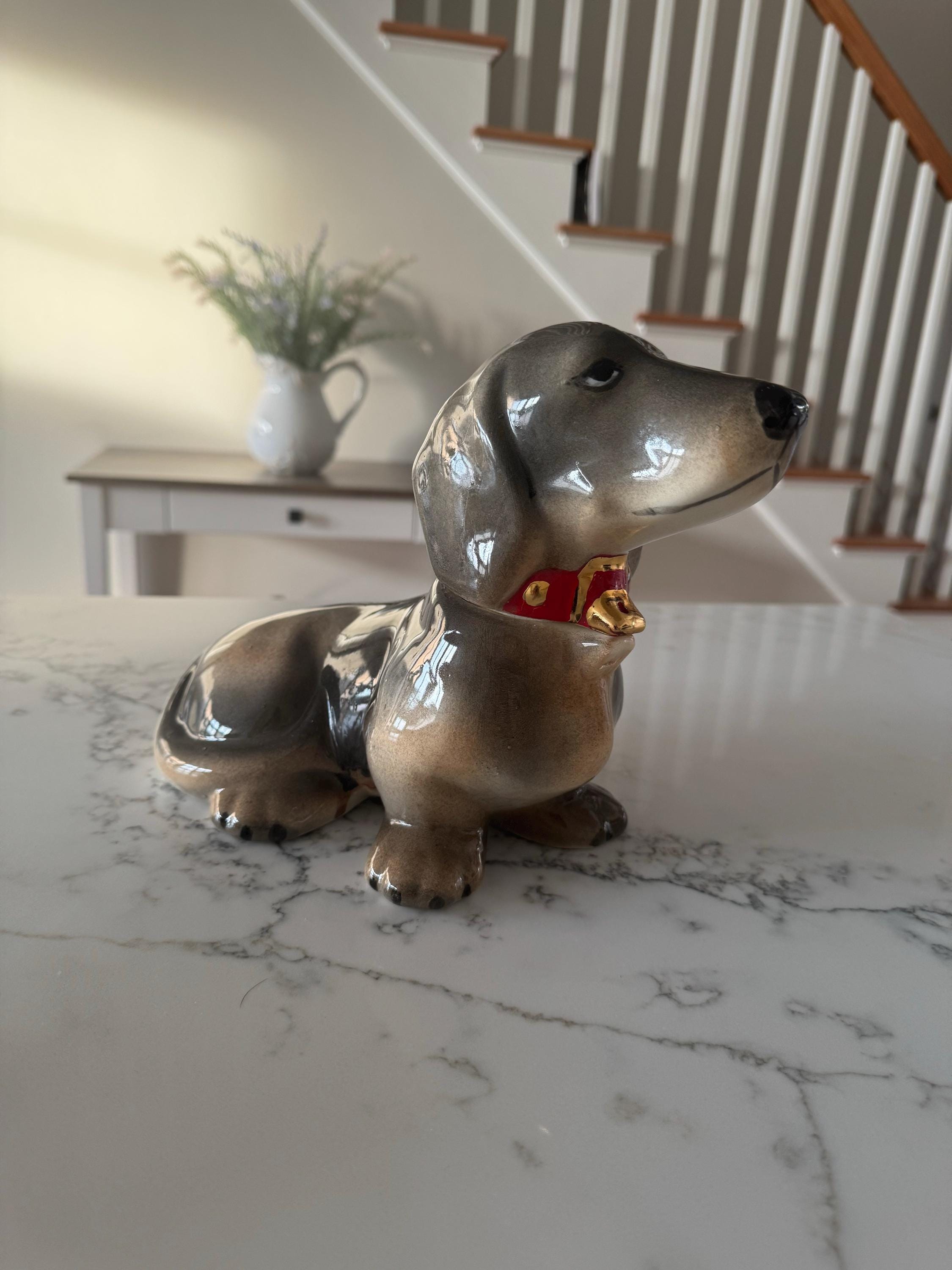 This is a great cookie/candy dish dachshund Doggy. It Measure 8 1/2 tall by 11 1/2 wide. The Dog is very realistic all hand made and air brush, the collar is red and accented in 14K gold. Please be sure that you want to buy this , Due to previous expirience Customers requested a cancellation and refund I issue the refund and buyer also keep The Item NO REFUNDS UNLESS I GET THE ITEM BACK BUYER PAID FOR RETURN!!!!!